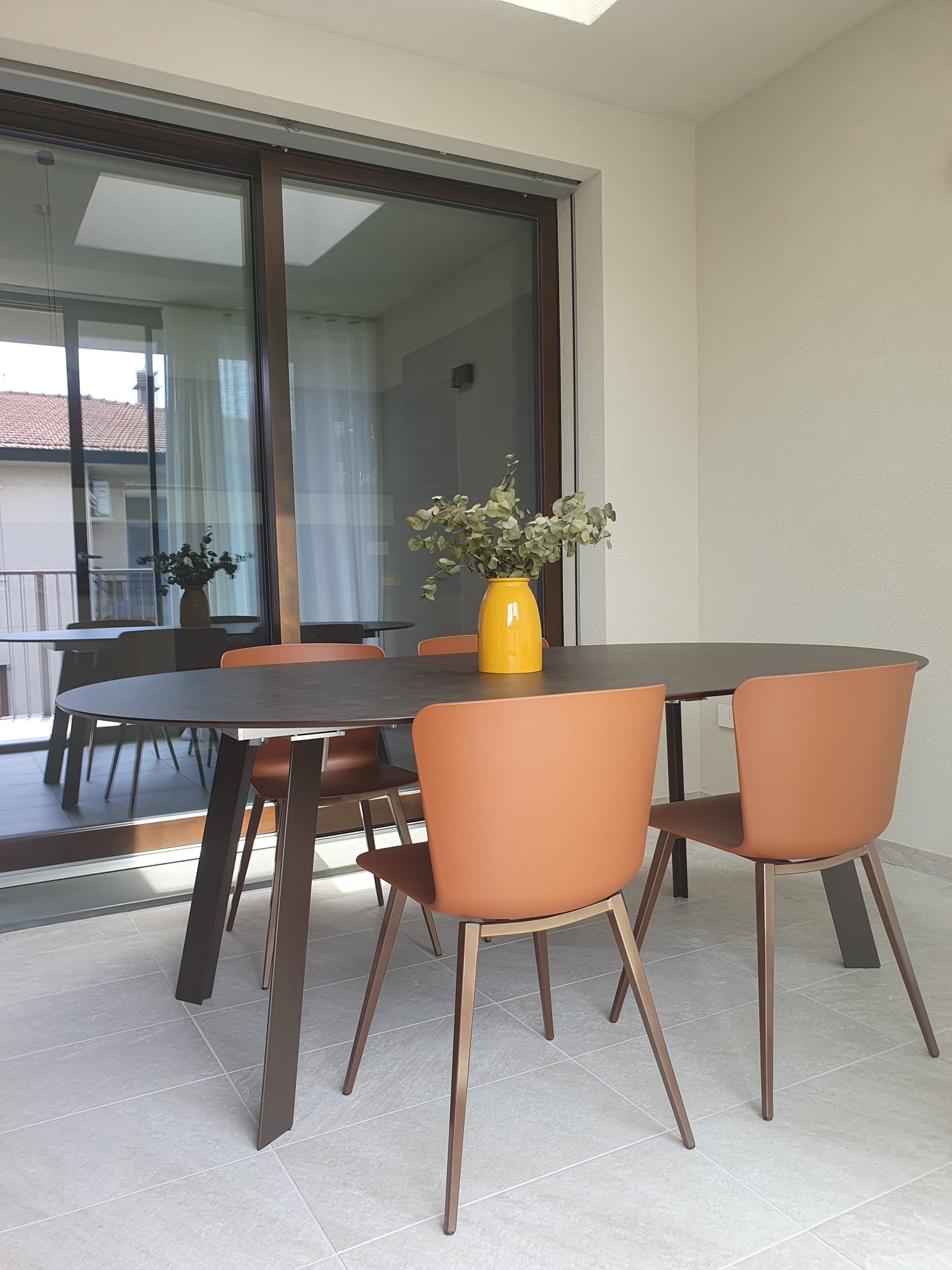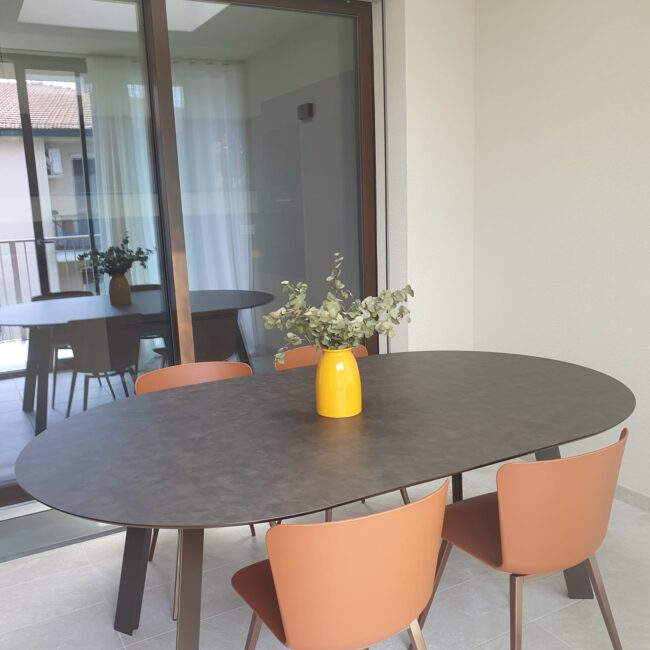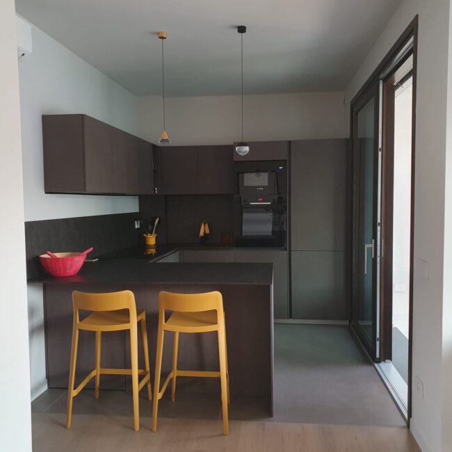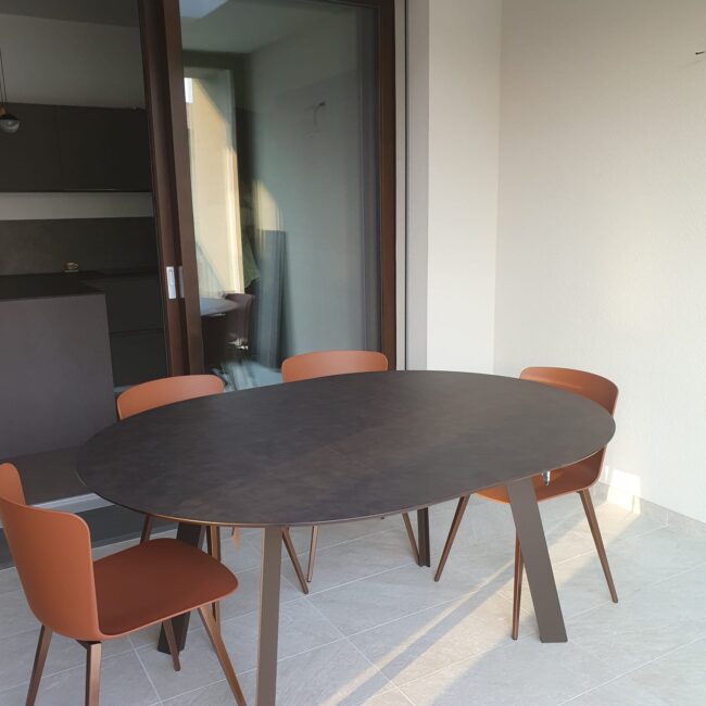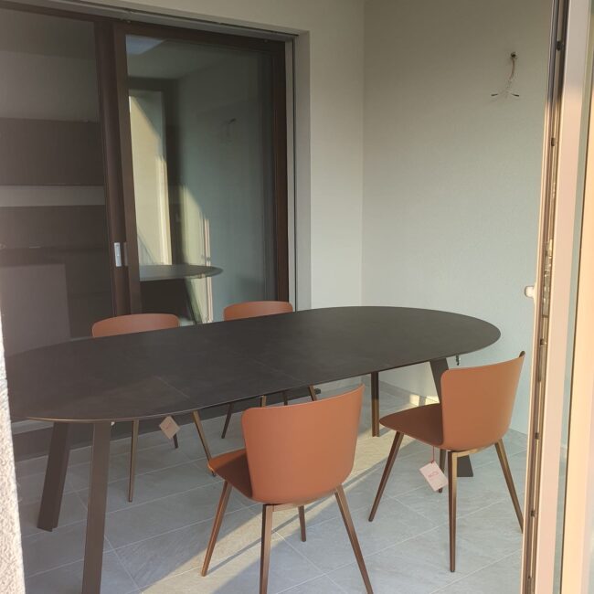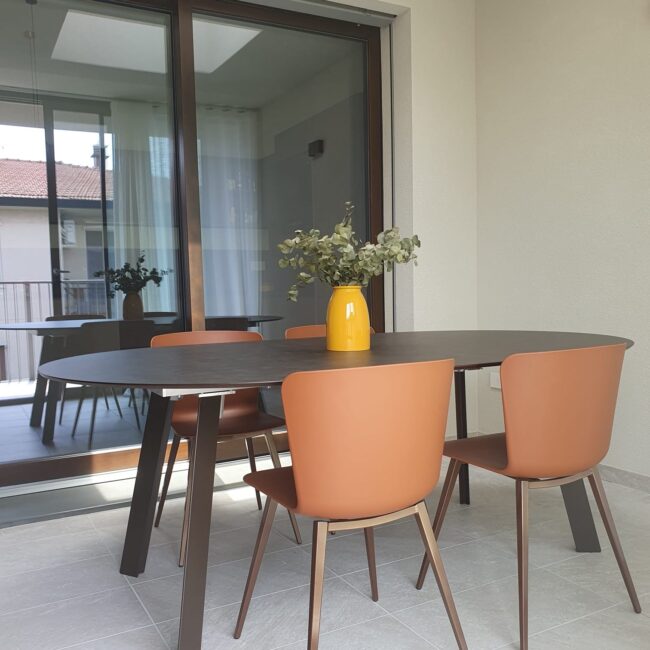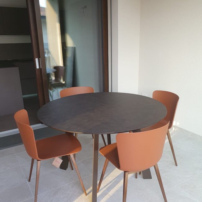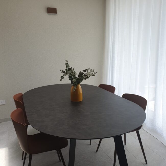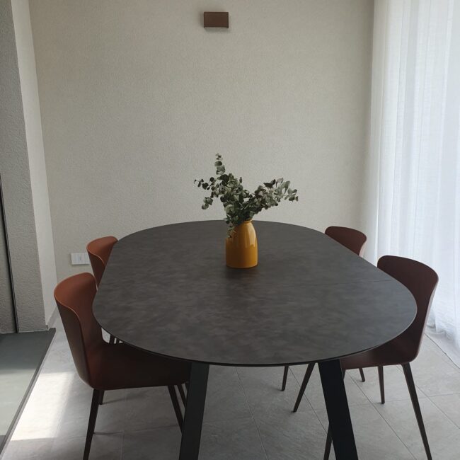 La vera sorpresa sono i dettagli cromatici: gli sgabelli Midi in giallo ocra, vivaci e inaspettati, scaldano l’ambiente e ne esaltano il carattere. L’armonia si estende alla zona pranzo, dove un tavolo allungabile in HPL si abbina perfettamente a sedie in terracotta, creando una continuità stilistica che rende l’intero spazio unico e accogliente.
