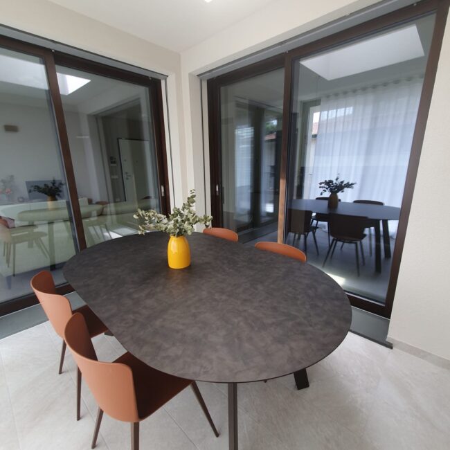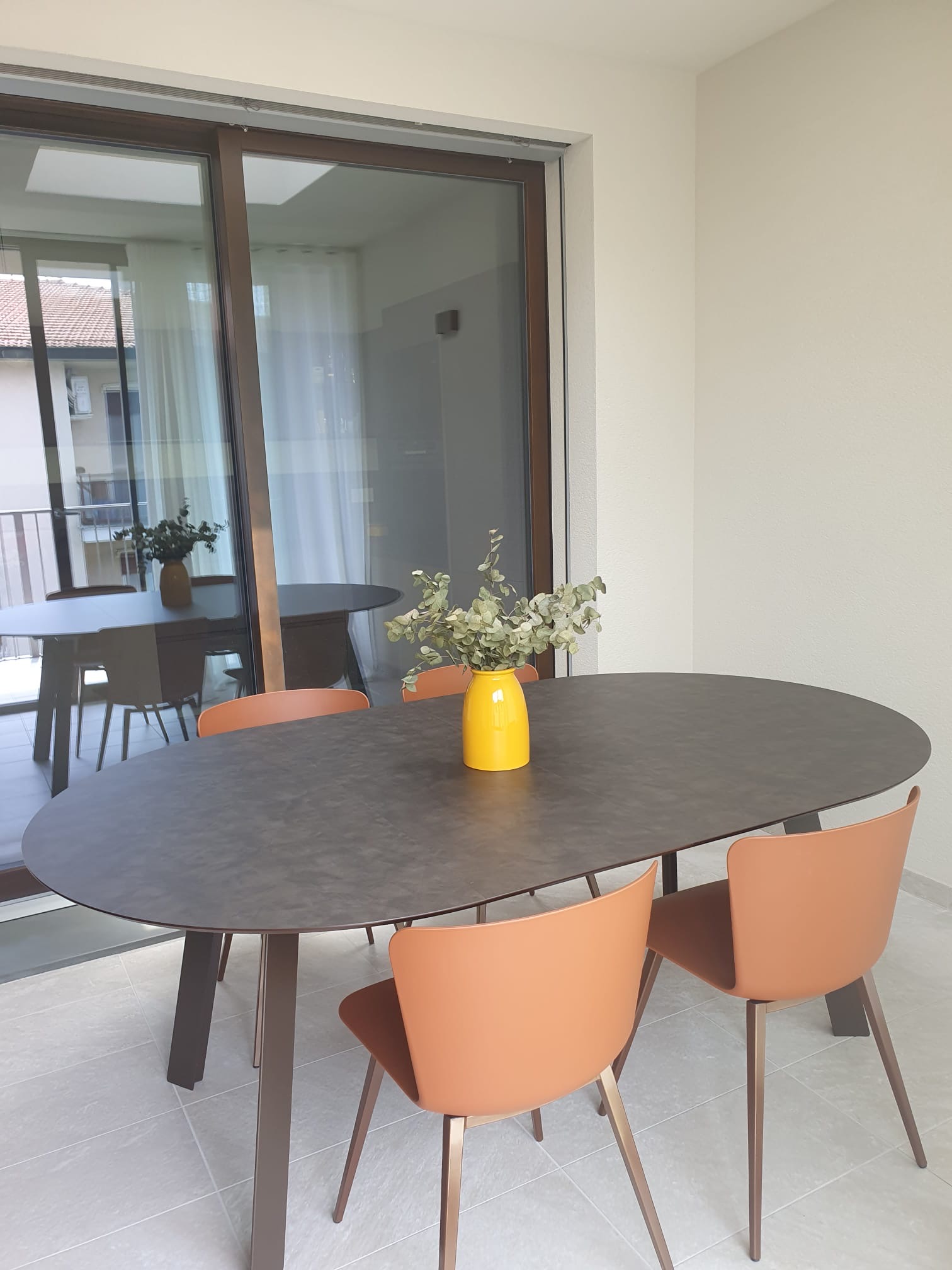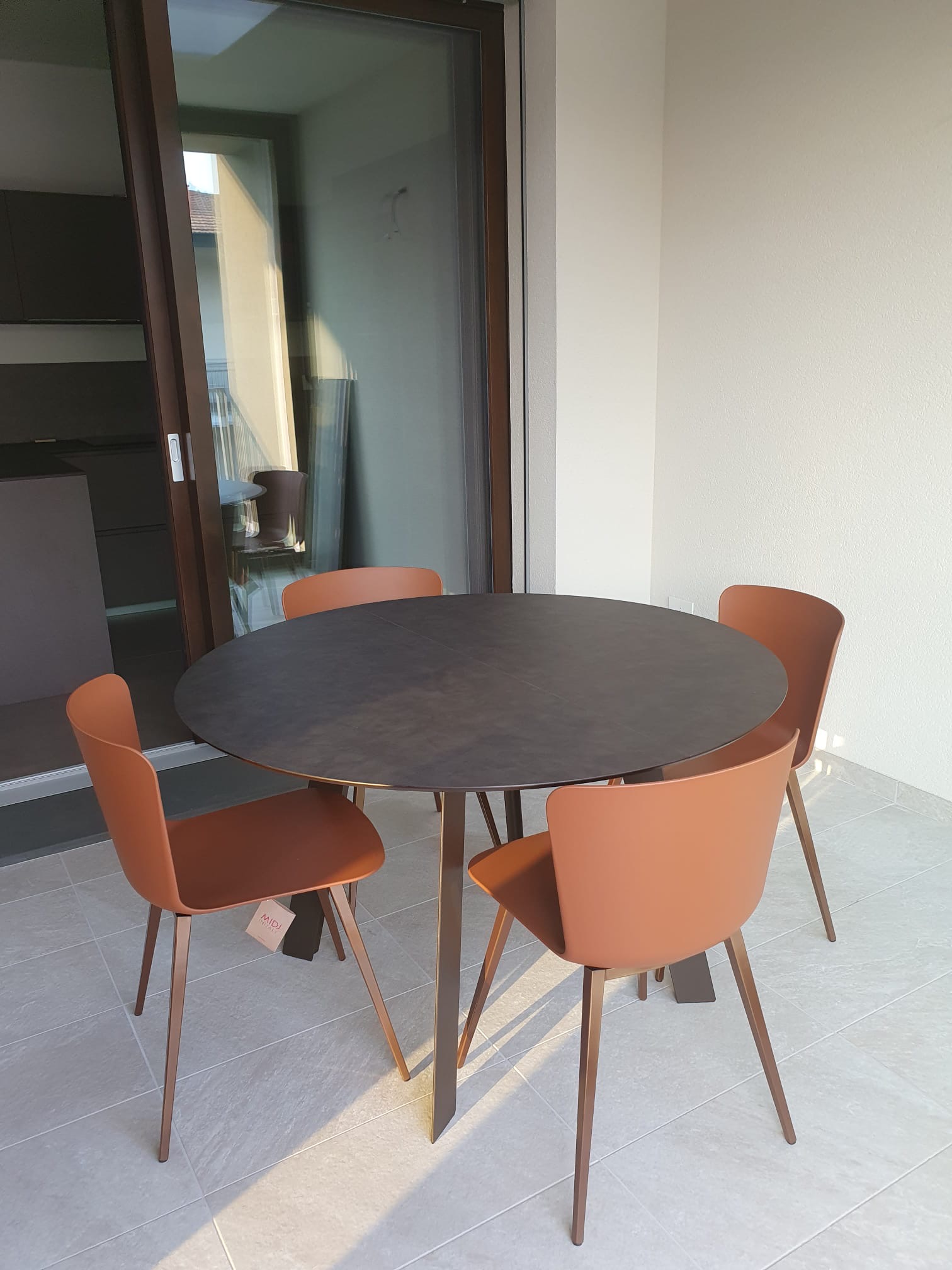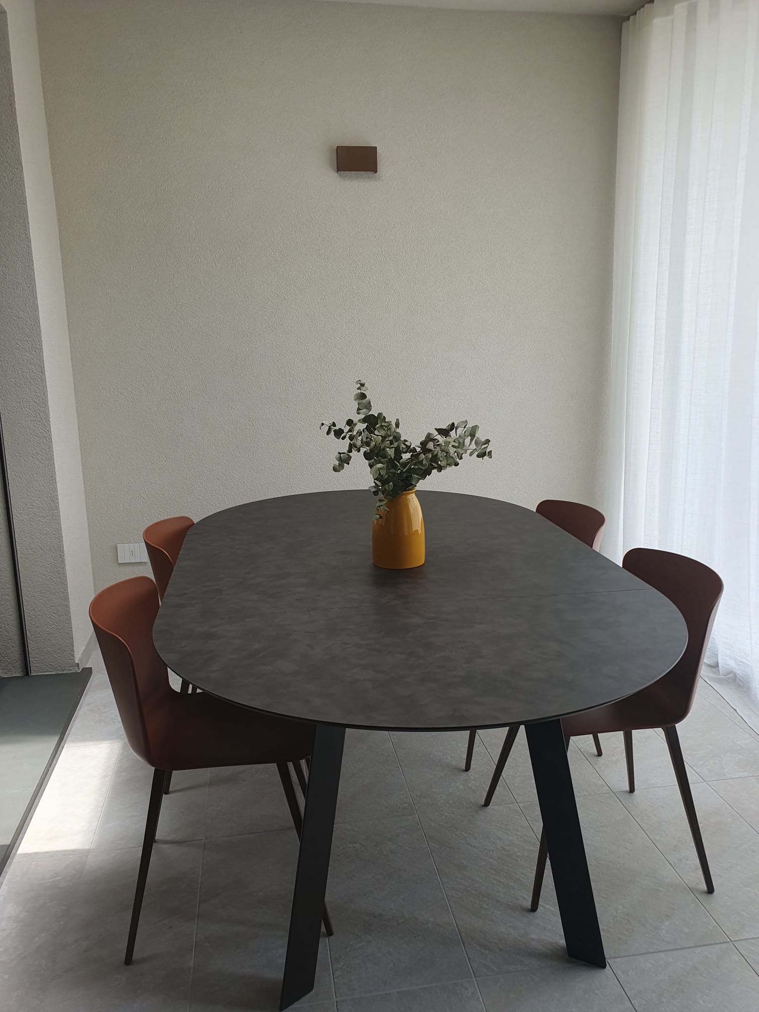 La vera sorpresa sono i dettagli cromatici: gli sgabelli Midi in giallo ocra, vivaci e inaspettati, scaldano l’ambiente e ne esaltano il carattere. L’armonia si estende alla zona pranzo, dove un tavolo allungabile in HPL si abbina perfettamente a sedie in terracotta, creando una continuità stilistica che rende l’intero spazio unico e accogliente.