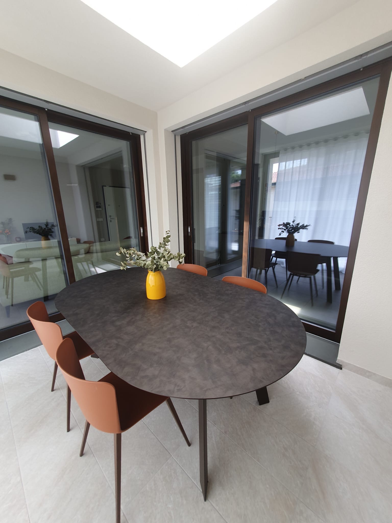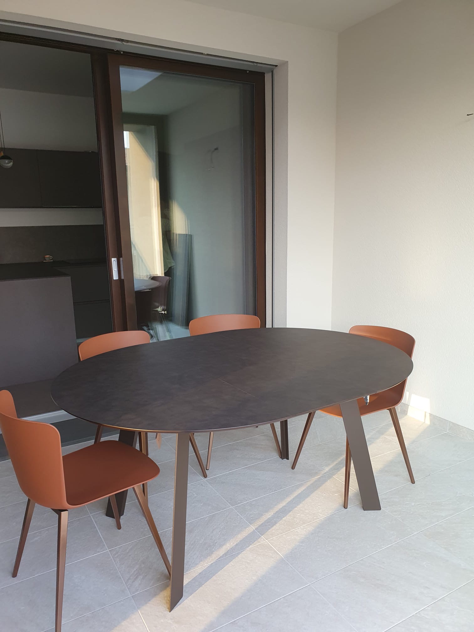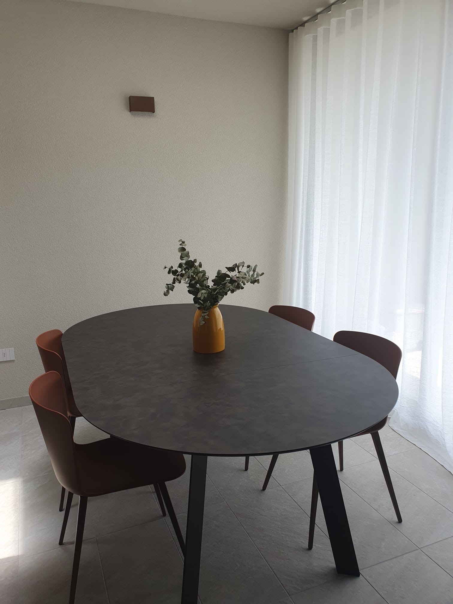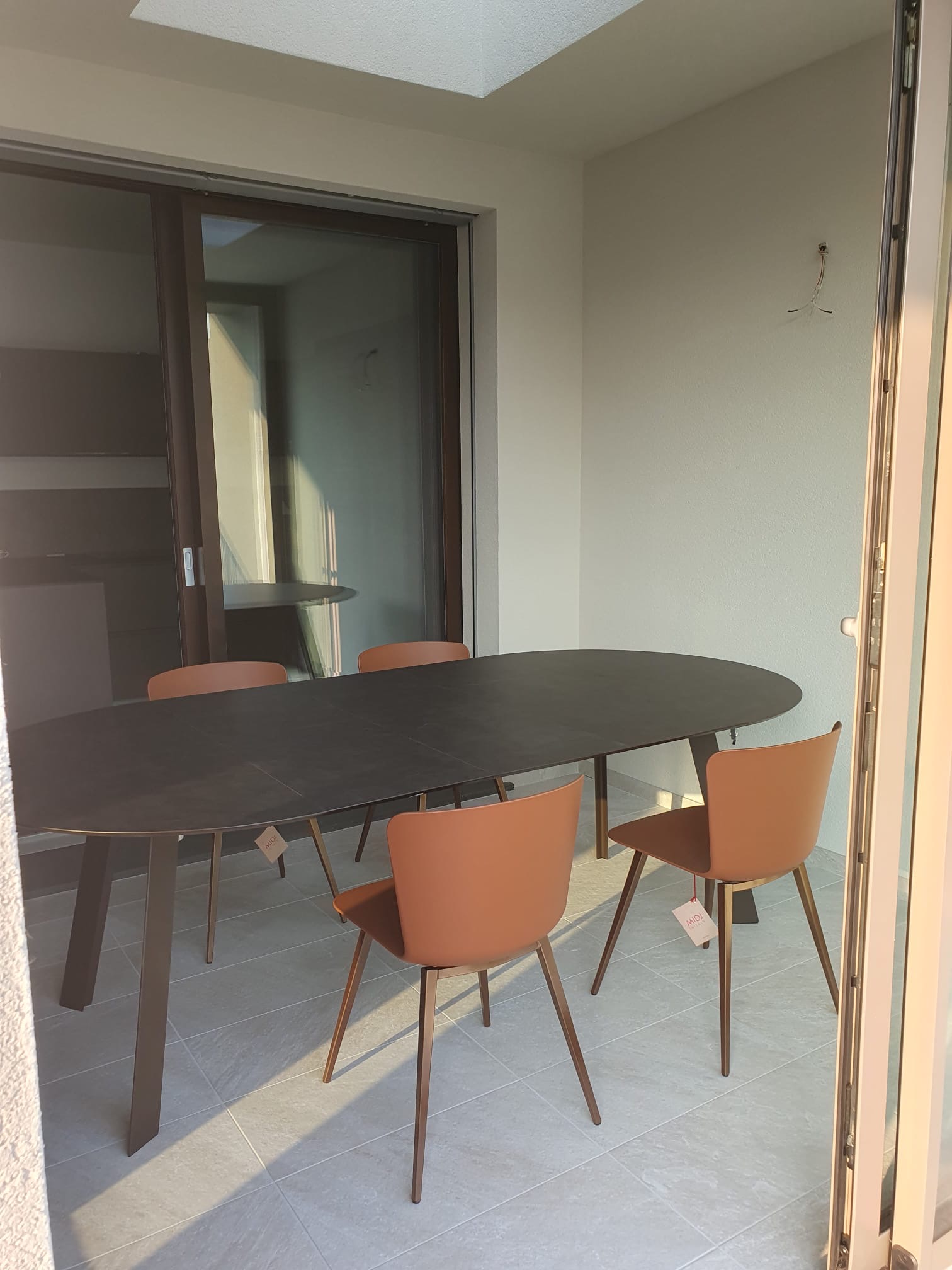 La vera sorpresa sono i dettagli cromatici: gli sgabelli Midi in giallo ocra, vivaci e inaspettati, scaldano l’ambiente e ne esaltano il carattere. L’armonia si estende alla zona pranzo, dove un tavolo allungabile in HPL si abbina perfettamente a sedie in terracotta, creando una continuità stilistica che rende l’intero spazio unico e accogliente.